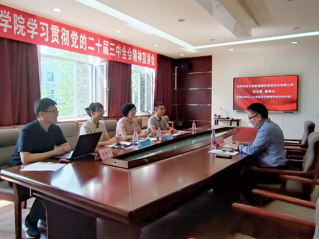 2024年9月6日上午,中国国际贸易学会理事、北京数通国软信息技术有限公司司汝军董事长访问经管公司,在329会议室举行座谈。经管公司经理王蓉、国际贸易教研室主任李岩、聂鸿天老师以及辅导员刘伟老师参加座谈。